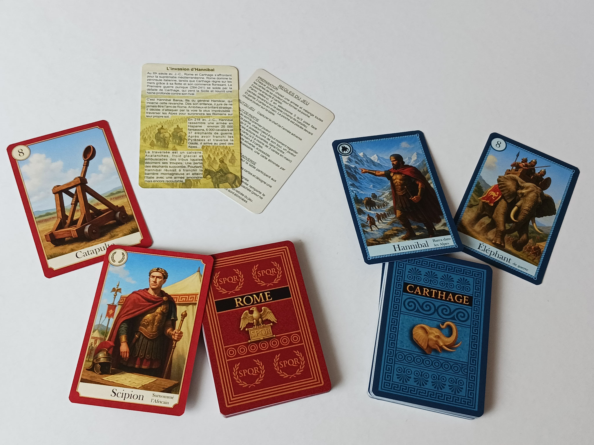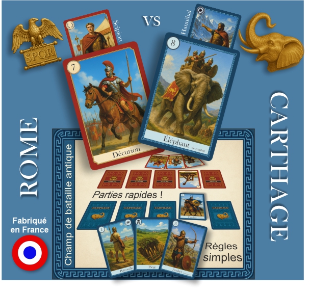 Découvrez Rome vs Carthage, un jeu de cartes qui vous plonge dans l’une des plus grandes rivalités de l’Histoire antique. Incarnez le général romain Scipion ou le célèbre Hannibal Barca et menez vos troupes vers la victoire.